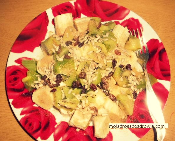 Sos: 2/3 ananasa, rukola, siemie lniane, rodzynki/ wode odlac/, przyprawy